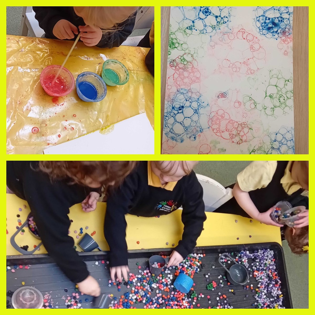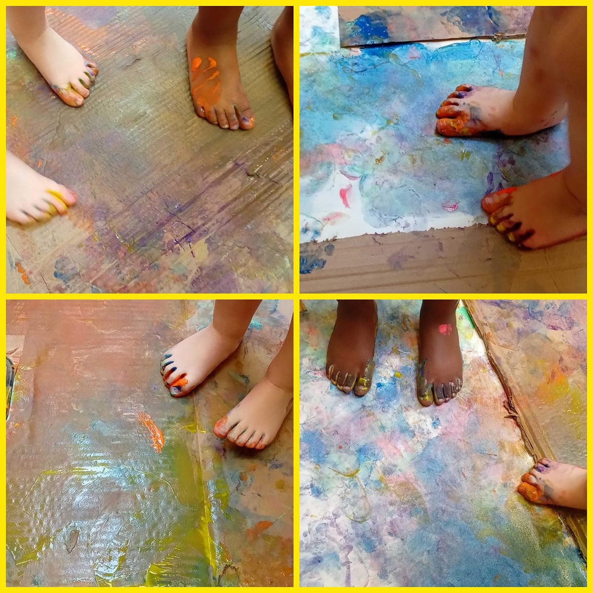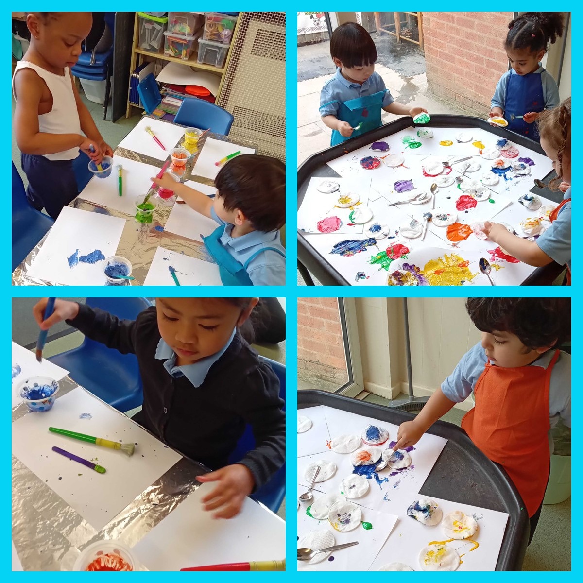 Expressive Arts and Design - Being creative with foot painting, bubble painting, cutters and paint to make patterns.