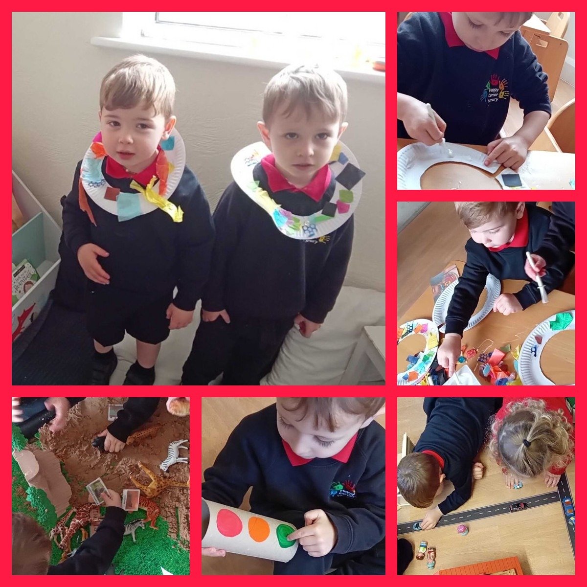 Expressive arts & design - creating tones of skin colour with different materials such as making play dough , painting paper plates to design faces, crayons to colour, gluing different texturde hair and exploring complexions colours using paint and hand prints. Traffic light colours and practicing scissor skills by cutting circles and rectangles.