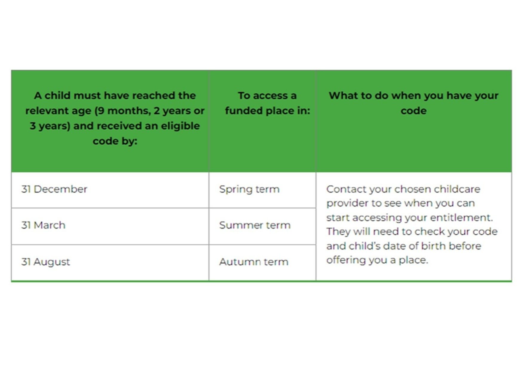 Your child can access the funded hours the term after your child’s relevant birthday, or the term after they receive their eligibility code – whichever is later.